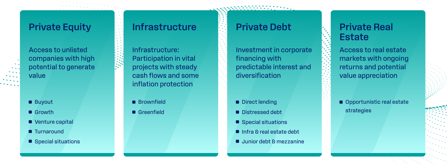 Private markets offer investors attractive opportunities beyond traditional capital markets. Targeted investments in private markets, such as private equity, infrastructure, real estate and private debt, can yield potential returns that are largely independent of the performance of liquid markets. Through their low correlation with listed investments, private markets also contribute to increasing diversification and reducing risk.