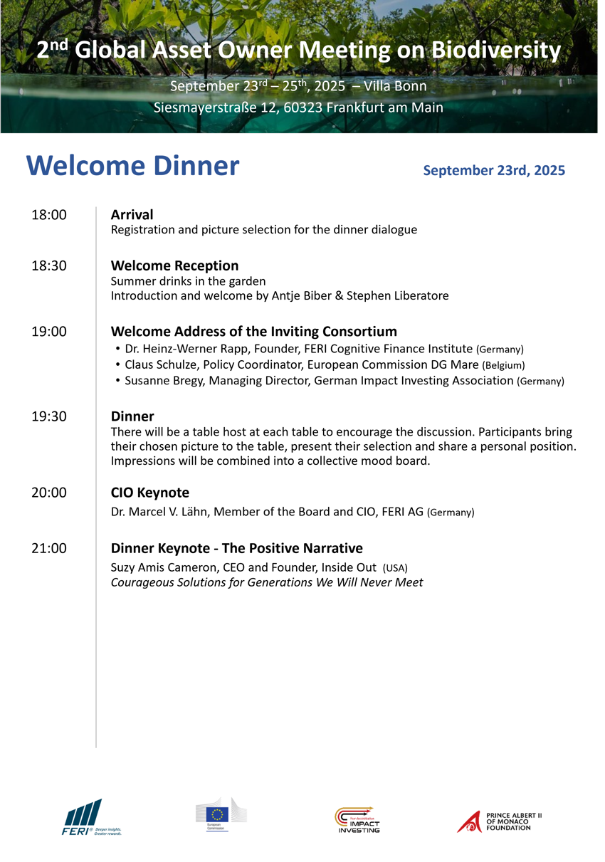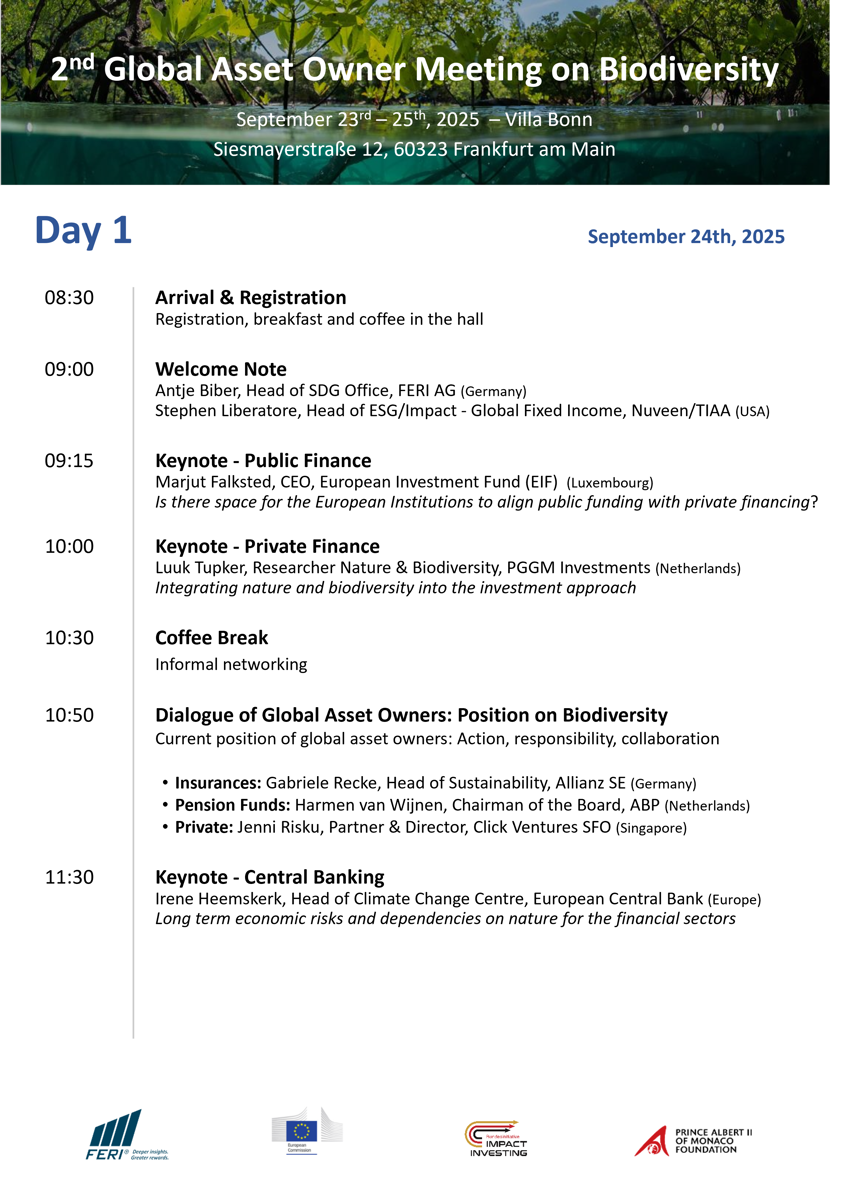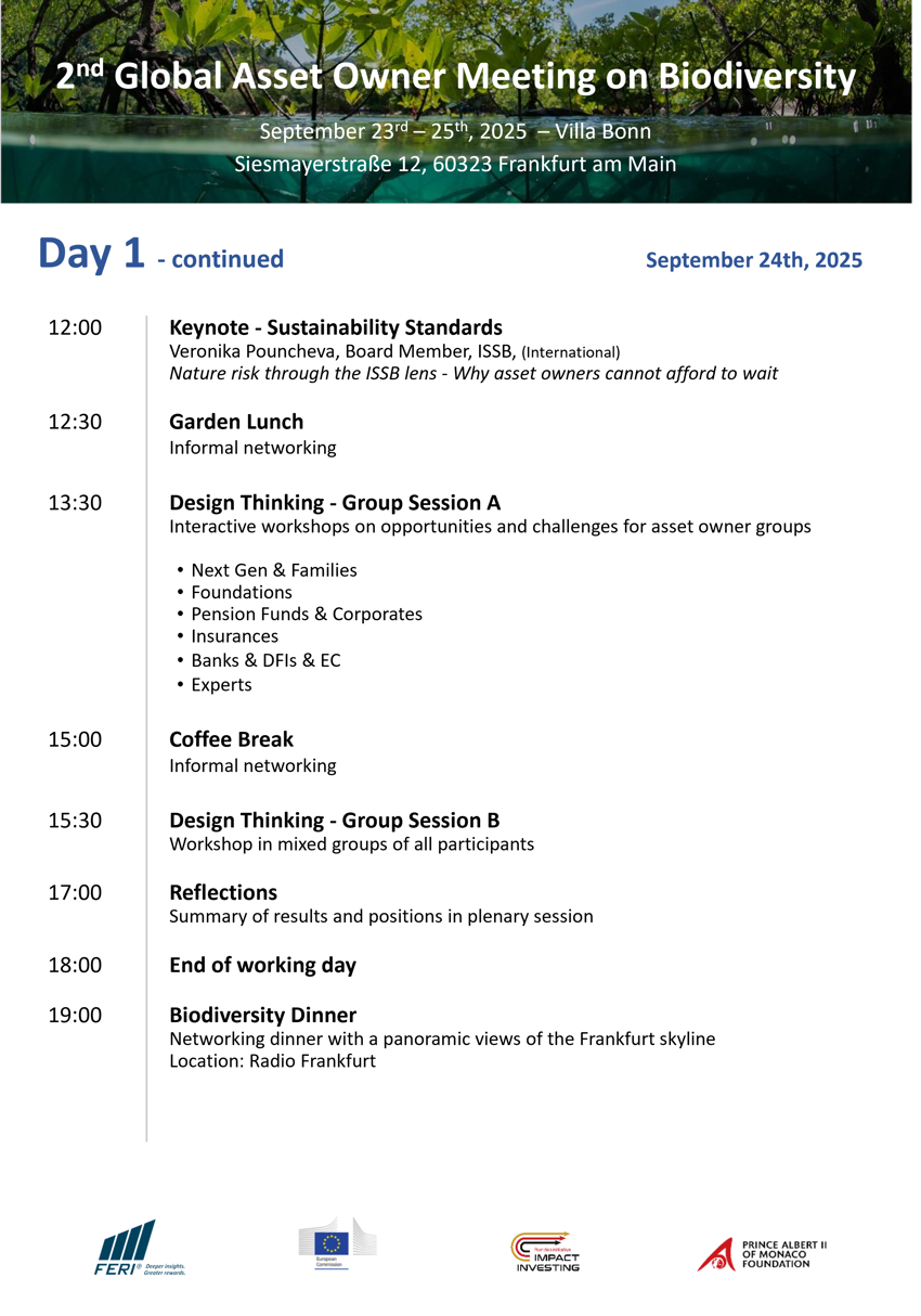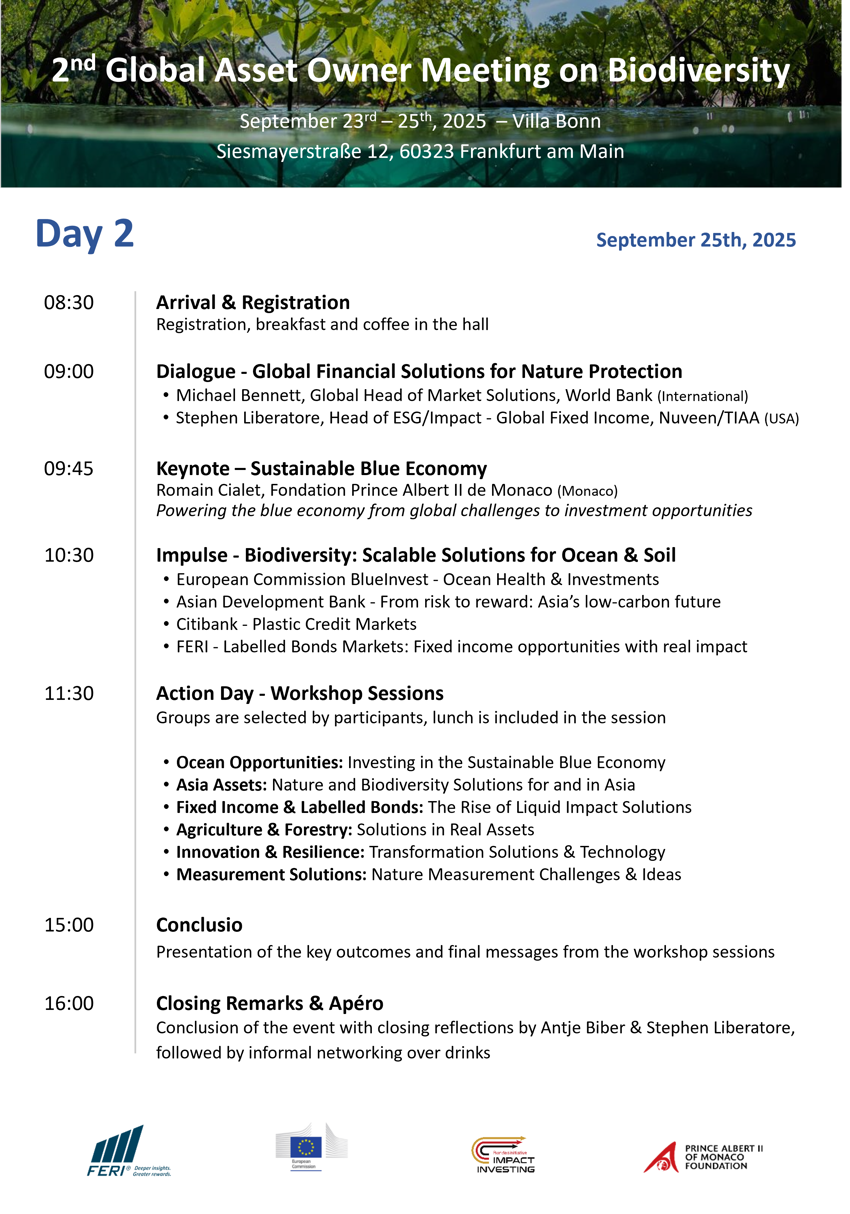 The second Global Asset Owner Meeting on Biodiversity will take place on September 23rd to 25th, 2025, at Villa Bonn in Frankfurt. Following the great success of the first meeting in June 2024, the event returns to assess progress in biodiversity investments and develop new strategies.
