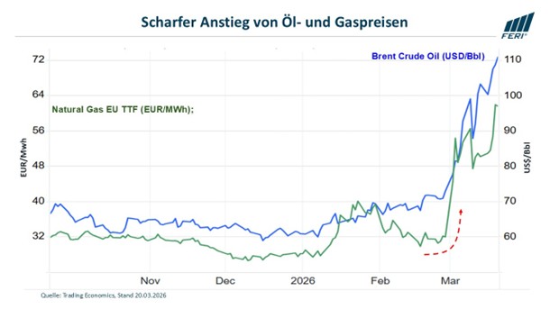 Mit seinem überraschenden Militärschlag gegen den Iran hat Donald Trump nicht nur die USA, sondern auch den Rest der Welt in eine schwierige Situation gebracht. Der Krieg wurde schnell zum Flächenbrand und erreichte die gesamte Golfregion. Die Sorglosigkeit reicher Öl-Emirate und deren Versprechen von Frieden und Wohlstand ist schlagartig herausgefordert. Zudem blockiert die weitgehende Schließung der Straße von Hormus einen der wichtigsten Transportkorridore der Weltwirtschaft: Rund 20 bis 25 Prozent der globalen Öl- und Gastransporte laufen in normalen Zeiten durch diesen maritimen Engpass. Hauptabnehmer sind vor allem Indien, China und andere asiatische Länder, die nun bereits unter Knappheitstendenzen leiden. Diese Fakten sind hinlänglich bekannt und spiegeln sich im scharfen Anstieg der Öl- und Gaspreise in den letzten vier Wochen (siehe Grafik 1: Scharfer Anstieg von Öl- und Gaspreisen).