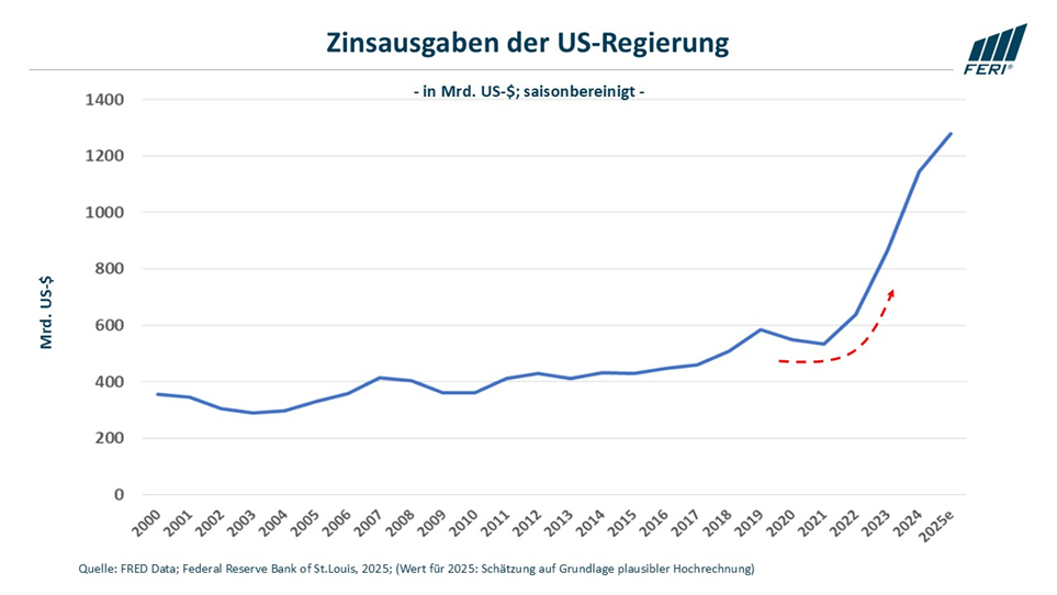 Speziell aus Sicht der USA sind ferner die rein materiellen Kosten des Kriegs relevant, die schon nach wenigen Tagen deutlich zweistellige Milliardenbeträge erreicht haben. Inzwischen hat der US-Verteidigungsminister für den Irankrieg sogar ein Budget in Höhe von 200 Mrd. US-Dollar beantragt, was sowohl die Staatsverschuldung als auch die Zinsausgaben der USA weiter nach oben treiben wird (siehe Grafik 2: Zinsausgaben der US-Regierung).