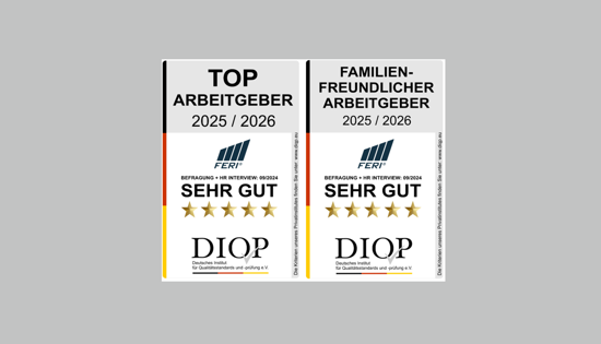 Die Vereinbarkeit von Beruf und Familie spielt bei uns eine wichtige Rolle. Das bestätigt uns das Deutsche Institut für Qualitätsstandards und -prüfung e.V. (DIQP), das uns wiederholt als „Top Arbeitgeber“ und als „Familienfreundlicher Arbeitgeber“ ausgezeichnet hat.